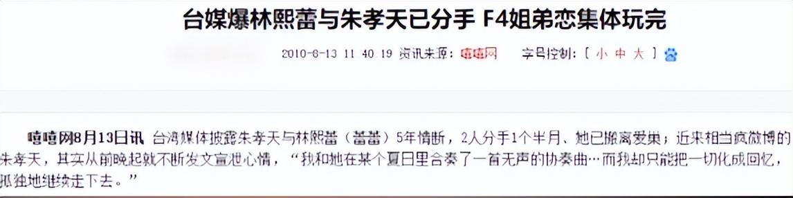 但2010年却传出了分手的消息,后来在《富二代之没有承诺的爱》的杭州采访现场,有媒体问朱孝天:“听说你跟蕾蕾(林熙蕾)已经结束了5年的感情?”