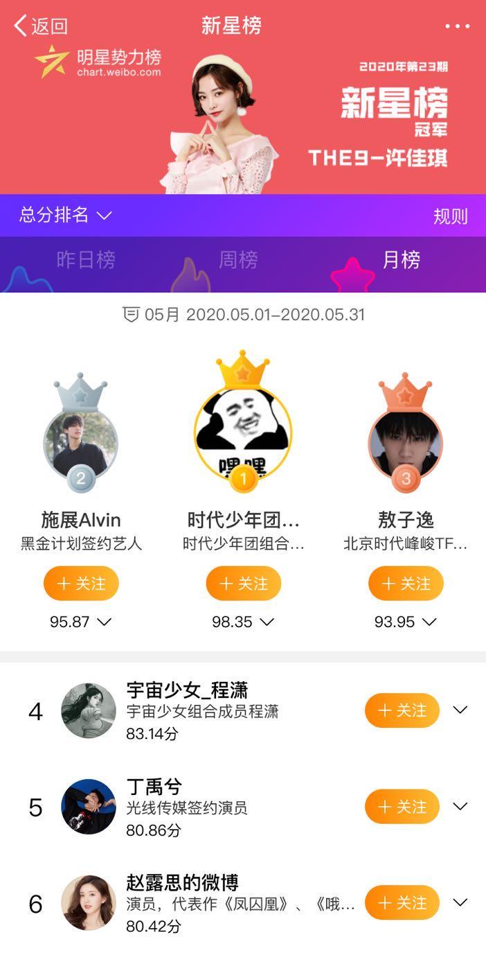 在上月内地新星势力榜中丁禹兮已经杀入前十强,排名第5,比赵露思还高一名。看来新剧的播出,因为观众反应好,所以圈粉无数,人气大涨。
