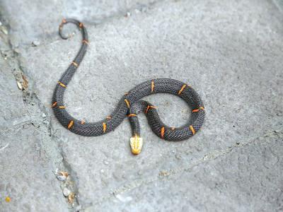 它的长度约60到80cm。背面黑褐色 背有朱红色横斑,左右横斑交错排列或在背中线彼此相遇;头部与颈背淡黄白色,具深褐色斑纹。头背具典型的9枚大鳞。它主要栖息于海拔100~1600m的丘陵山区,也出没路边、碎石地、稻田、草堆、耕作地旁草丛中,甚至会进入室内。晨昏活动。主要捕食小型啮齿动物和食虫目动物。