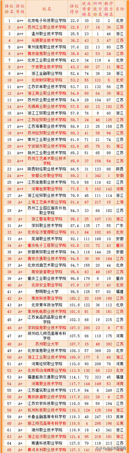 ps:高职高专毕业生就业质量,指的是2018~2020年各学校毕业生的平均薪酬和升本率(含国内升本和出国留学)。方法是将全国1302所高职高专毕业生薪酬和升本率按一定标准计算,得到全国高职高专毕业生就业质量排名,其中不同区域、不同省份、不同城市毕业生薪酬作归一处理。没有公布毕业生薪酬的学校,或公布数据低于所在城市当年最低工资标准的学校,按高于最低工资一定倍数计算。