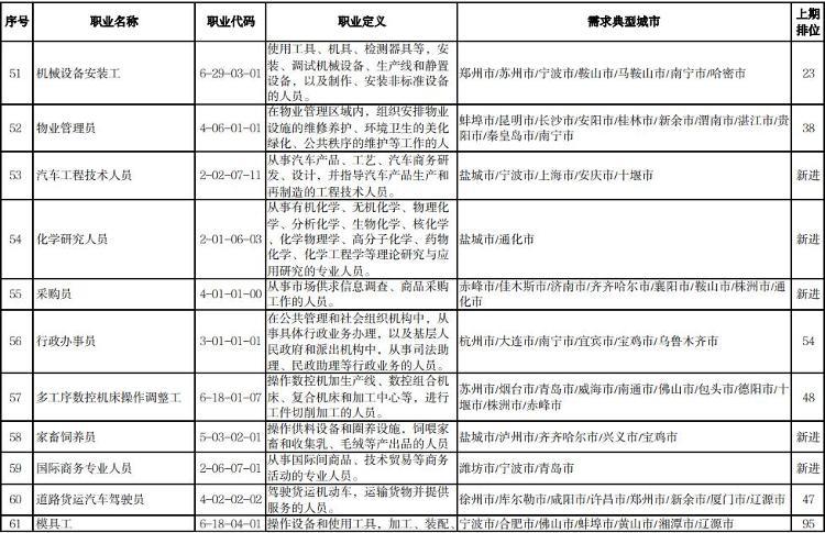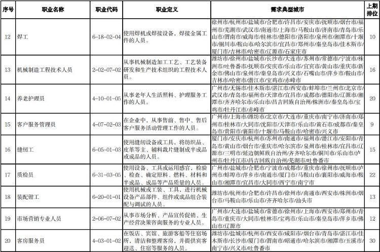 人社部介绍,本期数据构成据由“序号”“职业名称”“职业代码”“职业定义”“需求典型城市”“上期排位”六个部分组成。“职业名称”“职业代码”“职业定义”适用中华人民共和国职业分类大典的职业分类标准。“需求典型城市”是指填报该职业需求的典型城市名单,排在前面的城市需求缺口大于排在后面的城市。“上期排位”表示上期(2022年第三季度)该职业的排位情况。