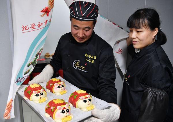 ↑1月13日,面点师将蒸制好的兔型花馍端出。新华社记者 李嘉南 摄