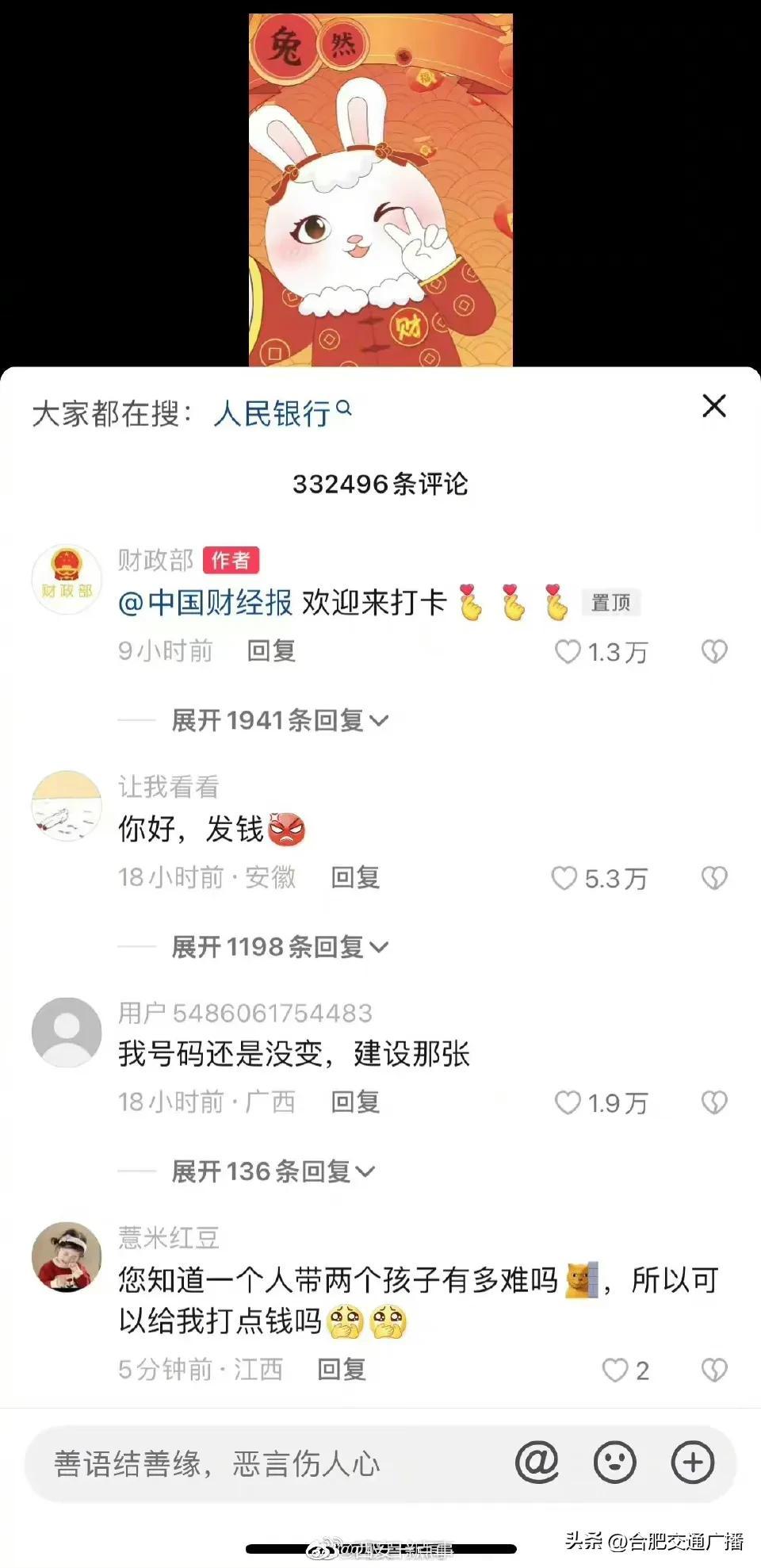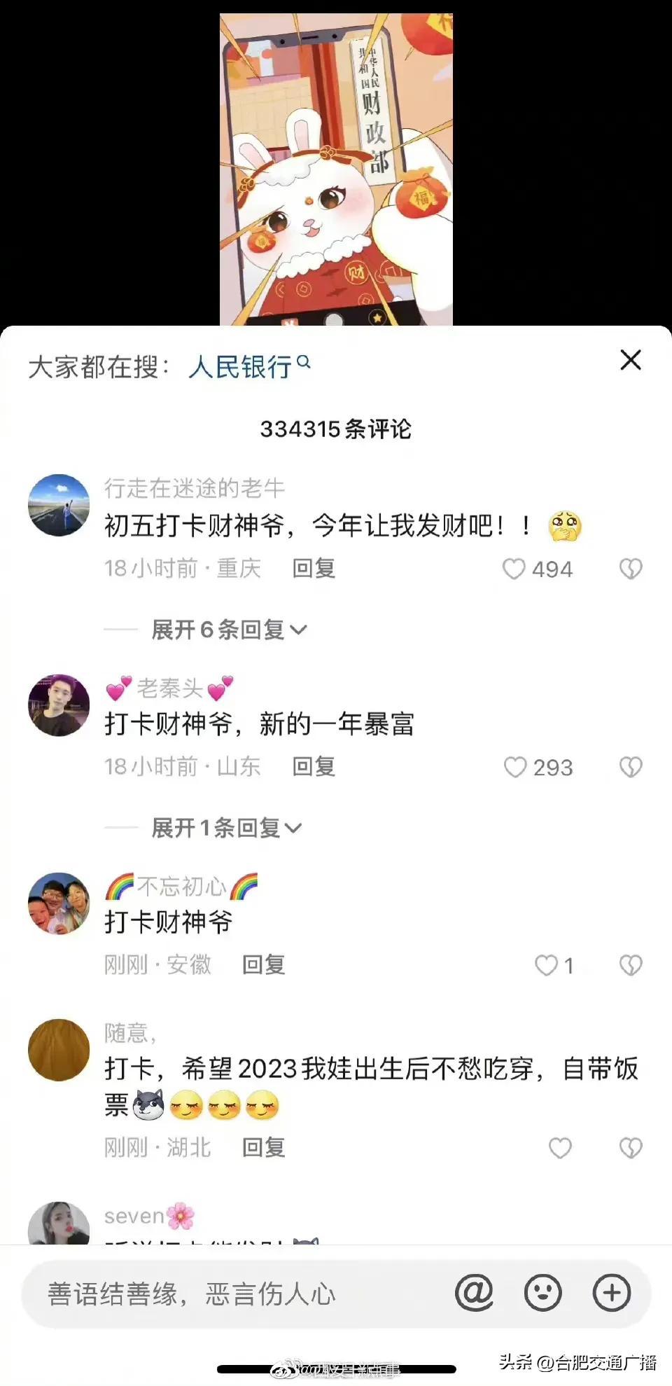 大年初五财政部账号成网友打卡地(网友纷纷给“真财神爷”花式留言) 2023-01-26 热点新闻 10916 作者:网友投稿 今天(1月26日)正月初五,是很多地方“迎财神”的日子。财政部在今天发了一条“都来打卡财政部”的动画短视频,引来网友们的点赞和转发,祈求新年“财运亨通”。